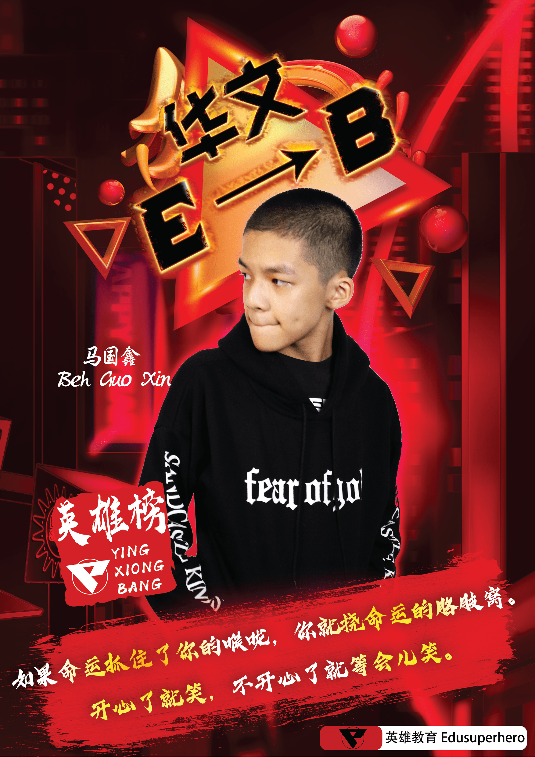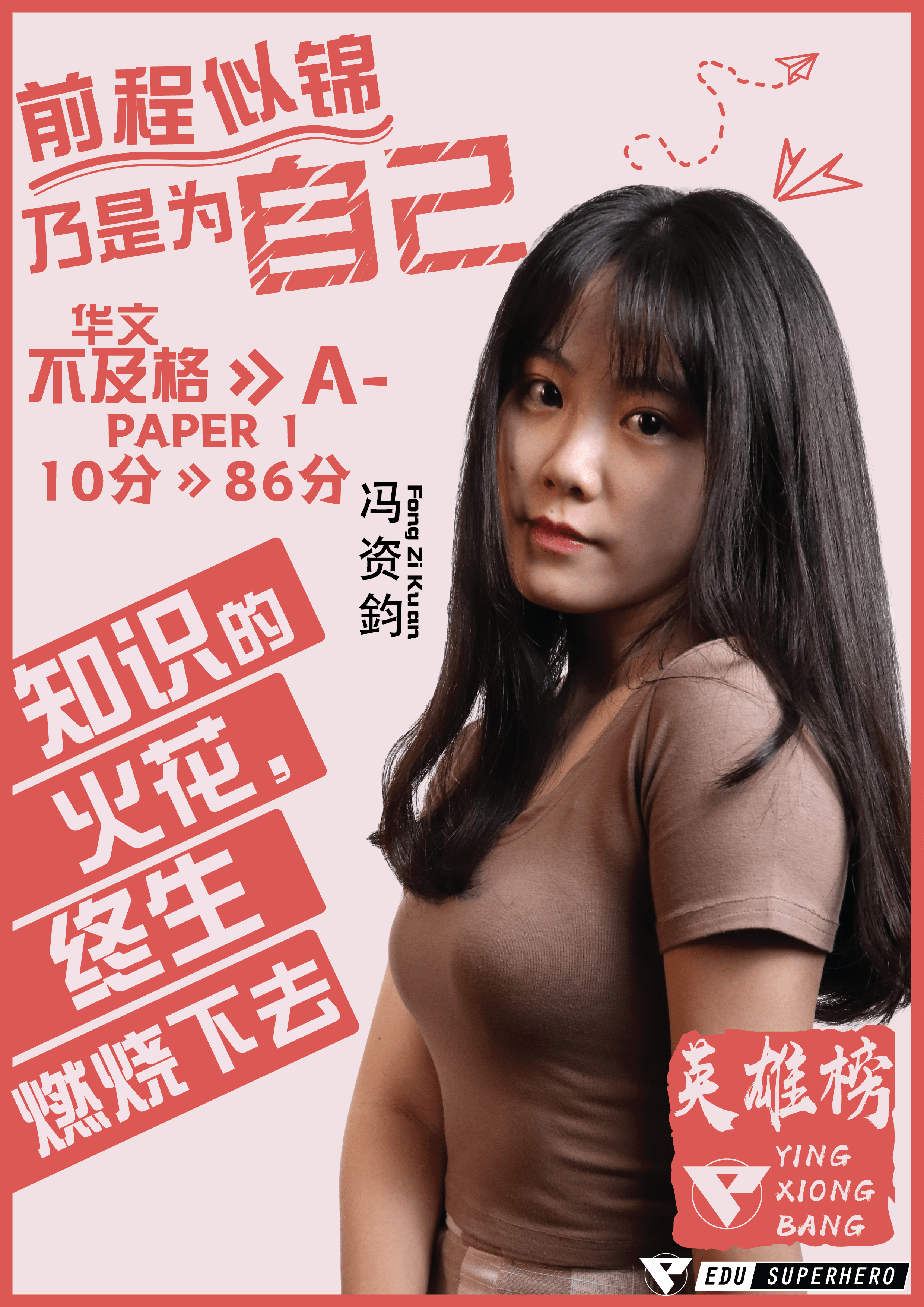 我是来自中五的冯资鈞,参加了英雄教育,发现上课真的很方便。随时打开手机开电脑就可以上课, 所有的老师都很可爱,我很喜欢他们 啊哈哈哈 尤其是口诀和作曲我都超爱 这让我考试前都很轻松也不用像以前死记硬背,上课时老师都时常传递正能量分享生活中遇到的大小事还有告诉我们待人处事,未来趋势,提高思维等 还有英雄教育一直举办讲座,所有的活动都超棒的。 英雄教育永远都是一条龙的服务,包办所有。只要跟着一起上课就不用再额外复习啦。也期待英雄教育还有更多的课程以及更多参加不完的讲座。参加英雄教育补习班后 我的华文从不及格到A- 还有sej都一直保持在不错的水平 ,也很开心可以在percubaan获得A 遇到适合自己的老师,真的很重要,庆幸我遇到啦!再来就是 感谢小稼老师传授的秘籍 也很感恩老师不嫌弃还用心帮我分析我的弱点告诉我那里需要改进,时不时被称赞得爽到爆!有时我的惰性是真的会带着我四处游荡,但是我又觉得不可以让老师失望,所以就决定和老师一起努力啦~ 还有谢谢Jack老师 让我深深爱上sej,还有就是我很喜欢每日objective题 我都乐在其中超开心的 。一直觉得10题罢了太少了吧,听不够 啊哈哈哈。特种兵向小J老师致敬!谢谢老师!还有最后最后我想说 多爱老师 因为只要你喜欢,学习就不是一件困难的事laaa!