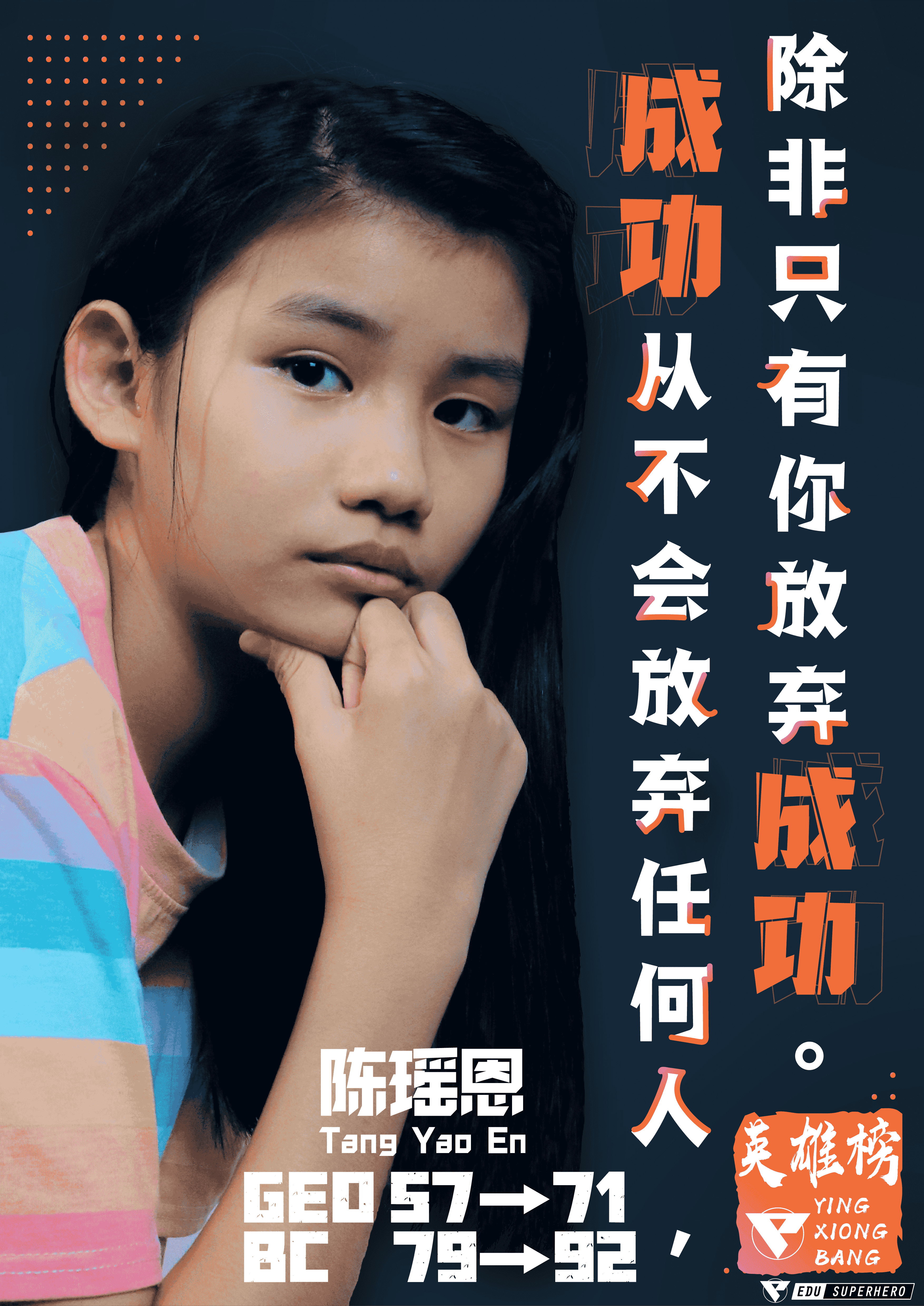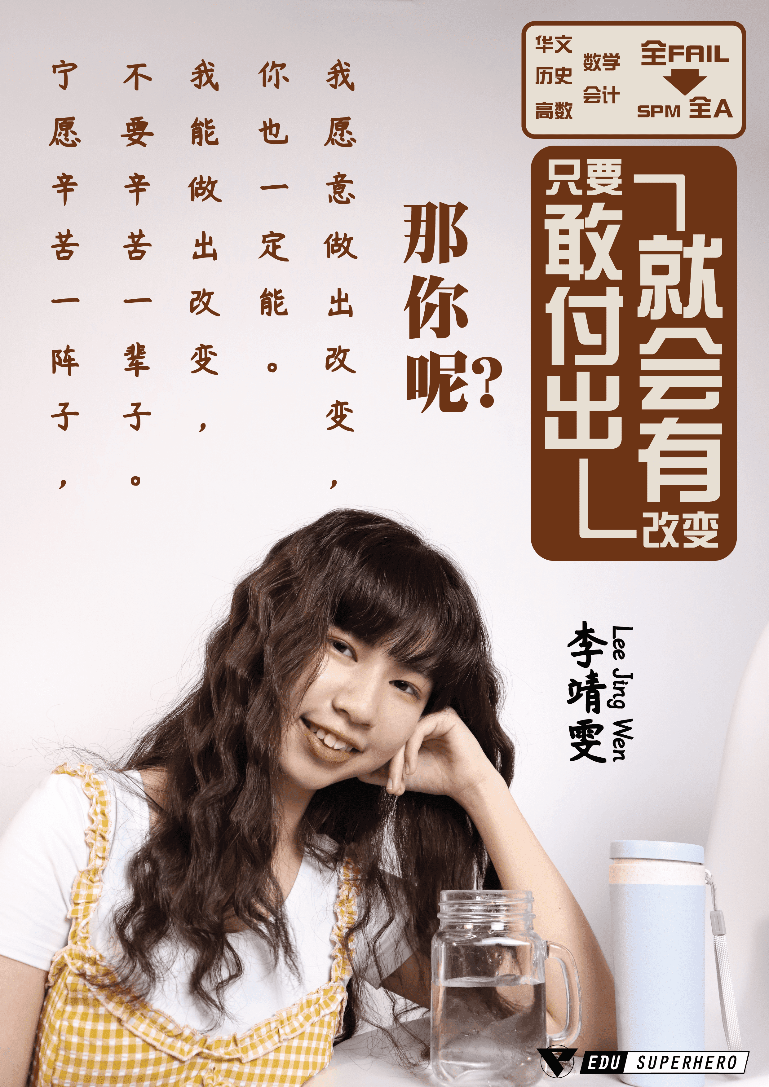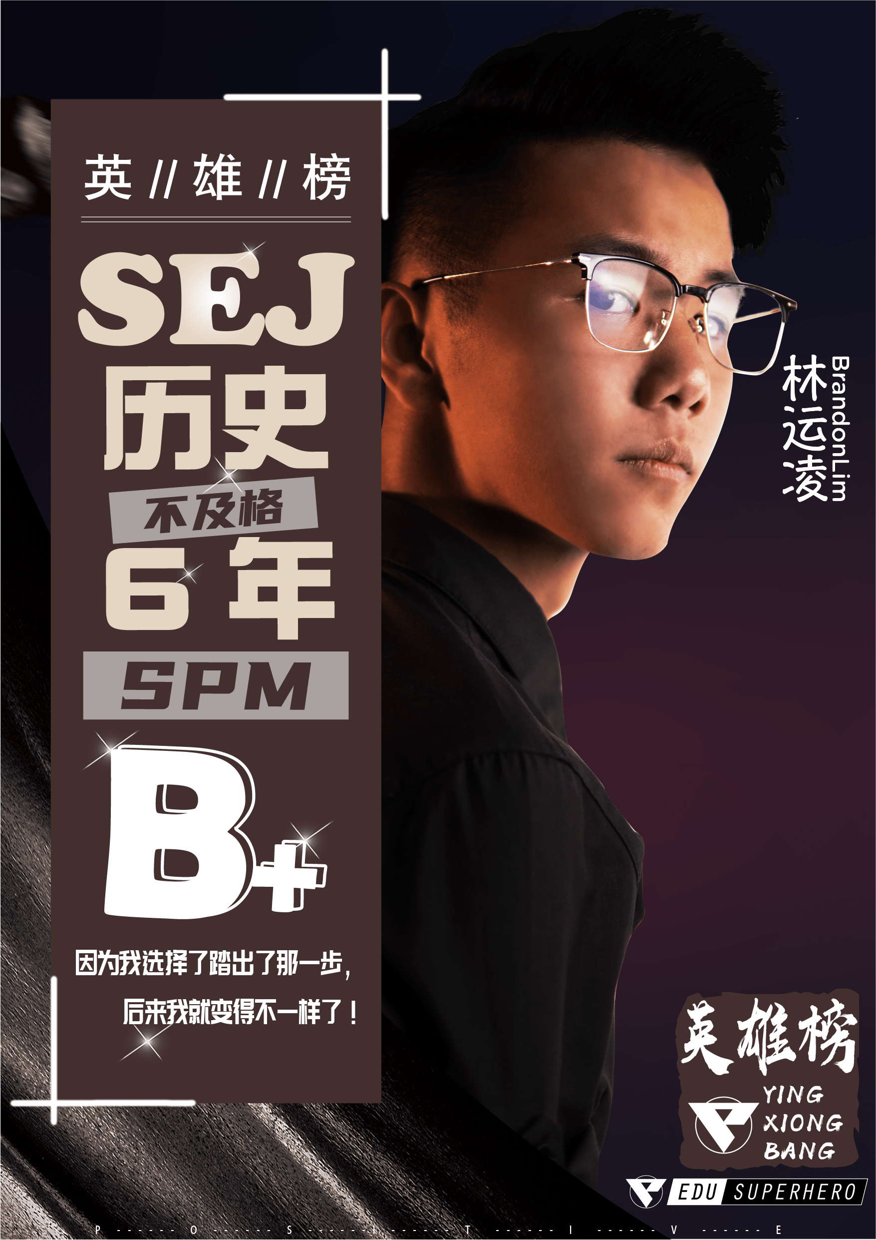 我从小都是成绩还算不错的学生,但马来文很差导致我上了中学后因不习惯老师用马来文为主教学而成绩一落千丈。中一刚开学我只去了学校一个星期就缺课快两个月,后来回到学校时,原本马来文就很差的我就更追不上同学们了。老师们说的我完全听不进脑。中一的第一次考试差不多全科不及格,这打击对当时的我我真的不是普通的大,因为那时候的我成绩从来没有不及格过。后来的我就抱着破瓶子打碎的心态度过了中一中二。在上中三的四月份时我突然意识到自己要面对pt3了,但我却还是什么都不会,我很慌张,于是我便决定要到补习中心补习,由于我的朋友从中一开始就在英雄教育补习,他的成绩很好,于是我就决定到英雄教育补习。基础慢慢打起来,我在pt3拿了全科及格的成绩。我从中四起,开始补全科并认真学习,所有科目都有明显的进步。中五这年我还出席所有的特攻队和最后战役,真的帮了我很多,把我从一个完全没有基础的学生变成了一个SPM 6A的学生。我真的亲眼目睹老师们的用心,他们真的用很多自己的时间来为我们准备额外的加强班,准备资料。他们不止用心而是真的有实力😽我从未后悔加入英雄教育,只后悔过为什么不在中一开始加入。在此要感谢Jack老师,稼老师和Sophia老师,没有你们我真的不会在SPM中考到6A的成绩🥰